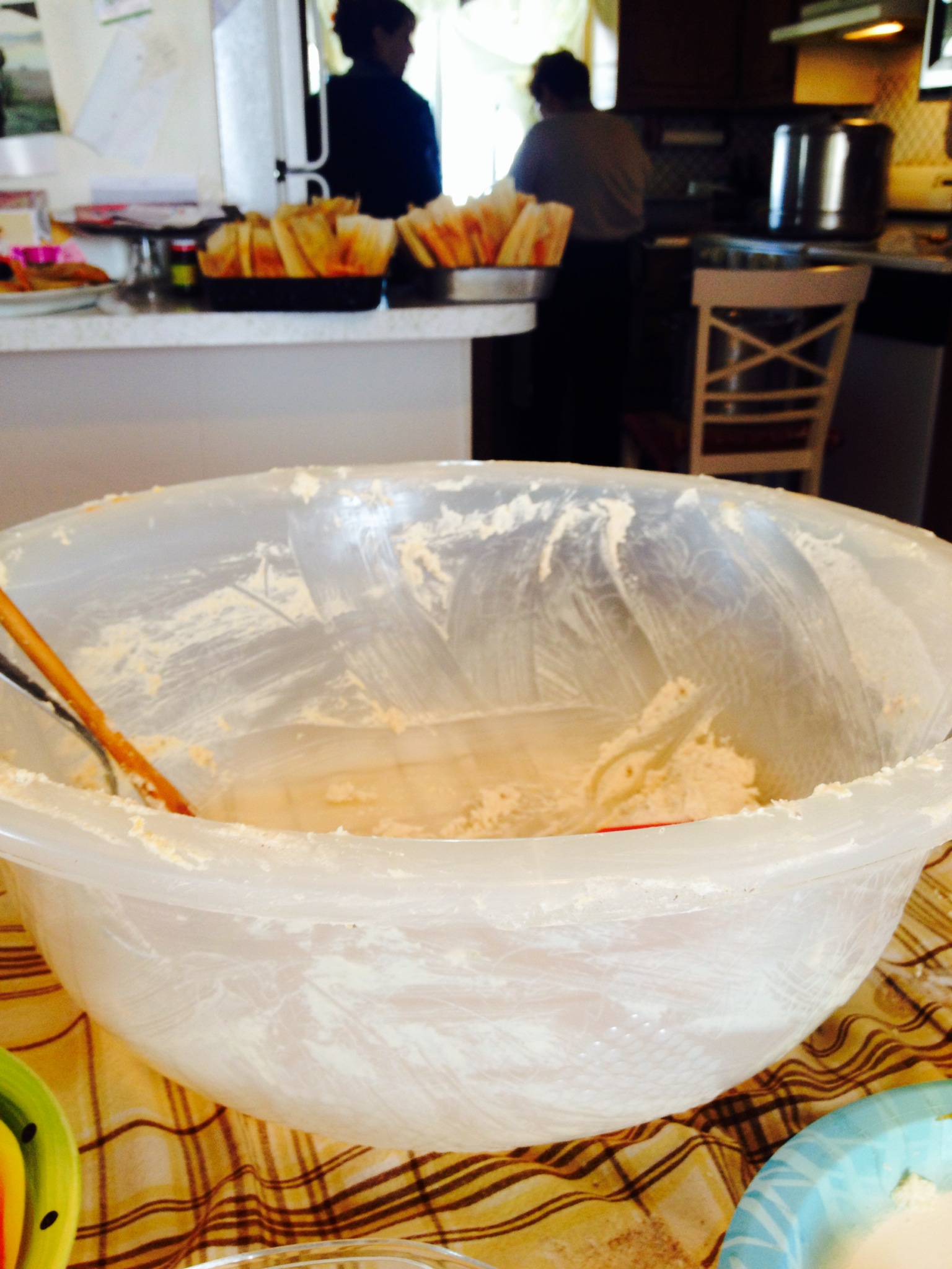 So every year my grandma, aunt, and I get together to make tamales for Christmas! We wake up early, throw our tamale making aprons on, and meet at grandmas house to drink our cups of coffee together! Then, we get to it! Mixing the corn dough with the vegetable shortening and broth, getting it the perfect consistency! We add salt as we go until it tastes just right! It’s a messy messy job, but our aprons love it!