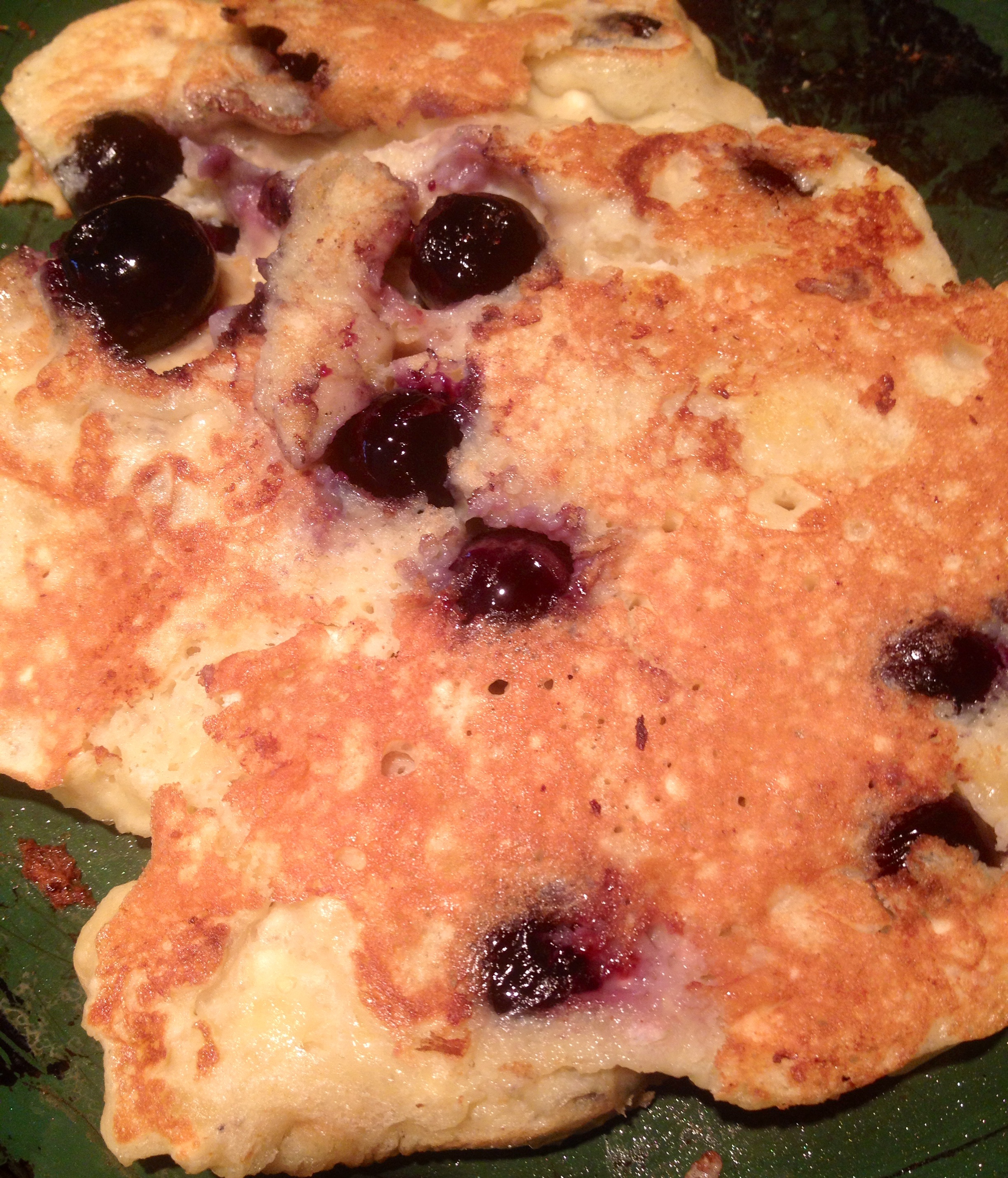 I smash the bananas up so it’s one gooey consistency. Then I scramble in the two eggs. Once it’s all mixed together I pour the blue berries in! (This is a lot of berries, so use more or less to your likings.) Cook the mixture on a flat pan just like you’d do any pancakes. This batter takes a little longer than regular ones so be patient! Leave the flame low and just let it cook a little longer.